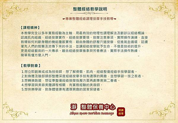 按摩應用包括運用花精啟動七大脈輪,手位傳遞正能量,淋巴經絡按摩與手觸寵物生理完整構造,皮膚肌肉層放鬆按摩